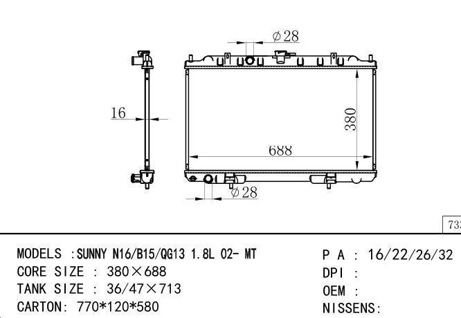 Car Radiator for NISSAN SUNNY N16-B15-QG13 1.8L